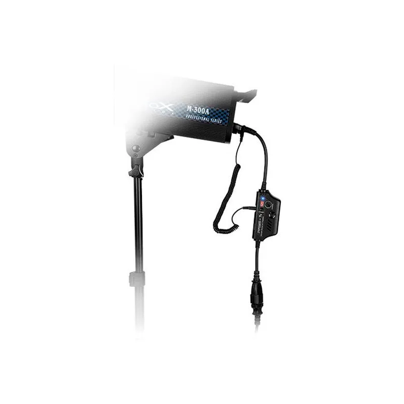 The set consists of two main parts, a transmitter and a receiver. The transmitter is placed on the camera and uses the middle contact of the hot shoe. The receiver is connected to the power supply of the flash head. You connect the receiver to the flash head with the short AC cable and then you connect the power cord to the receiver again.