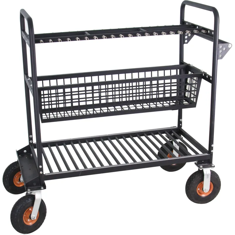 This Senior C-Stand Grip Cart, made of robust steel tube, can hold up to 20 C-Stands and features a steel basket for the placement of grip arms, grip heads, and other grip gear.