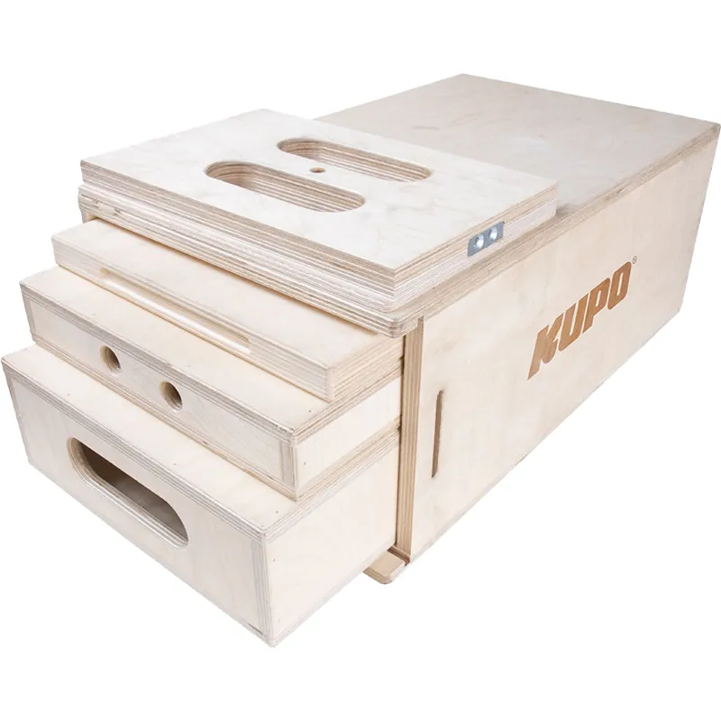 The Kupo 6 in 1 Nesting Apple Box Set offers a space-saving design, allowing pancake, quarter, and half apple boxes to fit neatly inside the full apple box. It features slots on both sides of the full apple box for securing it to a dolly with a ratchet strap, making it ideal for camera mounting or as a seat for the cameraman. The pancake apple box includes a 3/8-16 threaded female mount for attaching small lights or accessories. Its innovative track design with a magnet allows for easy sliding and locking of the side panel.
