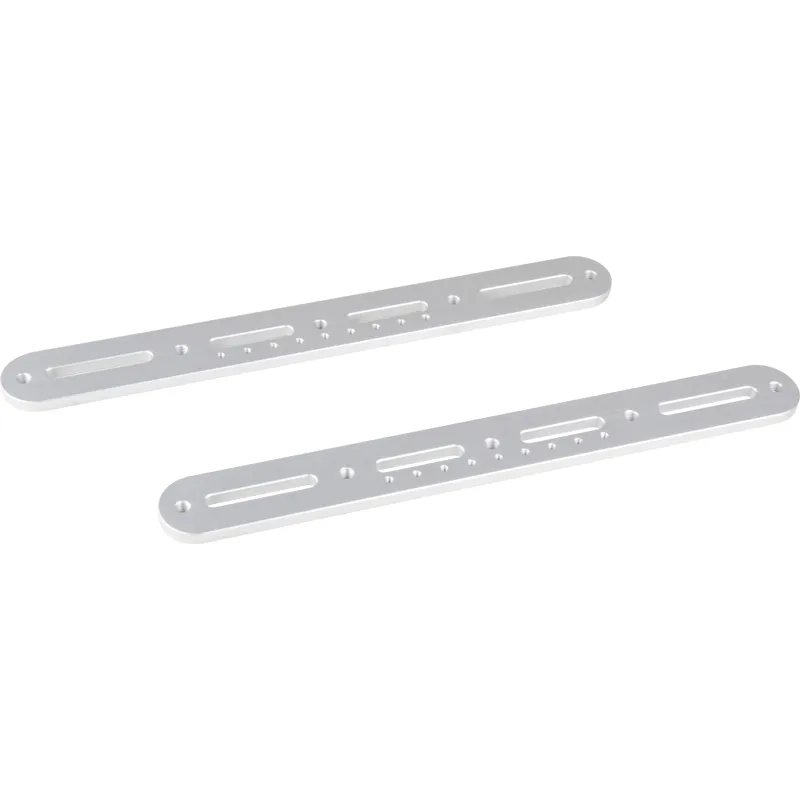 This 45cm long aluminum plate is tapped with M5 x 9 and 3/8-16 x 4 threads. It features 4 slots that allow for flexible rigging points for standard 3/8-16 bolts. This makes it a useful gadget for various applications, including car, motorcycle, bike, or any other camera mounting needs.