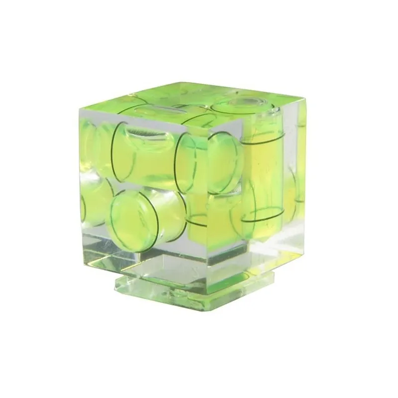 This bubble level allows you to level a camera on three planes. The bubble level comes encased in a crystal clear housing with green fluid, and mounts effortlessly into the hot shoe of the camera.