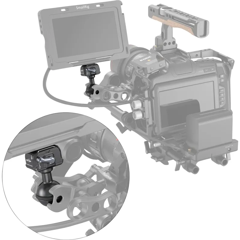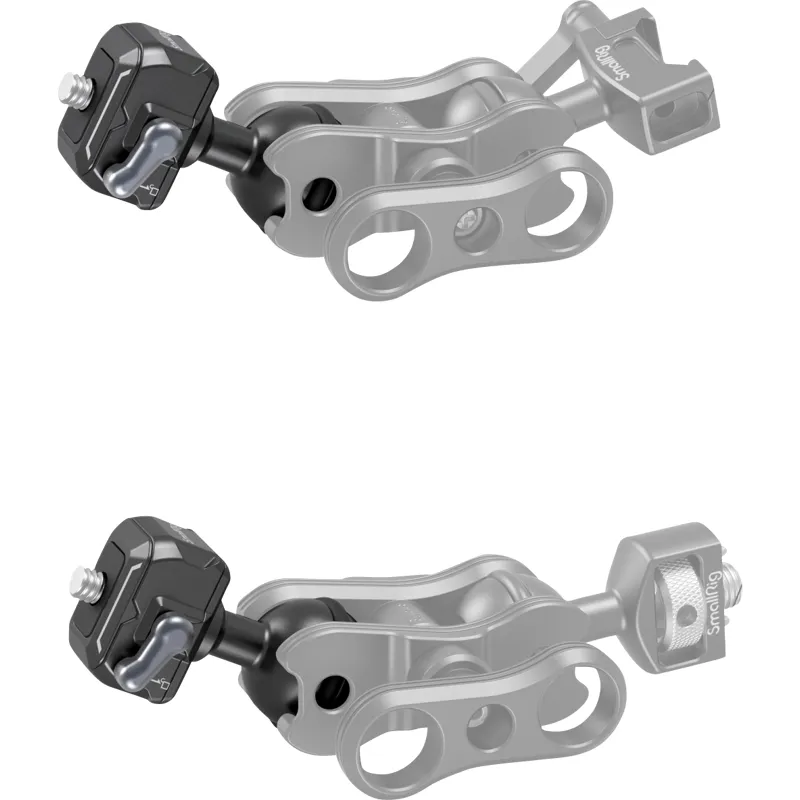 SmallRig 1/4"-20 Quick Release Ball Head 3600, one end is attaching to the ball head and the other end of the quick release plate can fit devices with 1/4"-20 threads, such as cameras, monitors, cages, mounting plates. It can buckle vertically and stably into the baseplate, causing no deflection. It can be locked and unlocked through a click, provides an easy operation. Rubber pads on the ball head increase its friction between the ball head and the clamp, thus ensuring a secure locking. This ball head is also interchangeable with the ball heads at both ends of Magic Arm 2070/2071/2072.