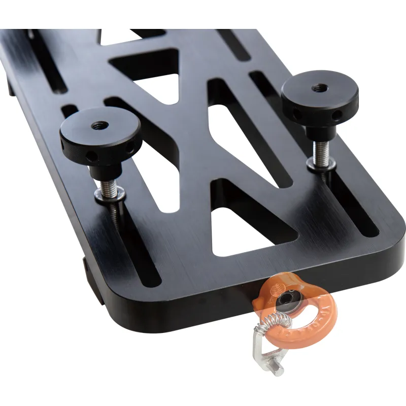 The bracket is made of 24mm thick aluminum plate with black anodized finish, allowing you to turn a step ladder into a tripod for capturing high-angle shots. It can be securely mounted on the step ladder with four adjustable hooks that accommodate ladder steps up to 3mm thick. With 4 slots, this bracket can be mounted on ladder steps with a maximum width of 40cm.