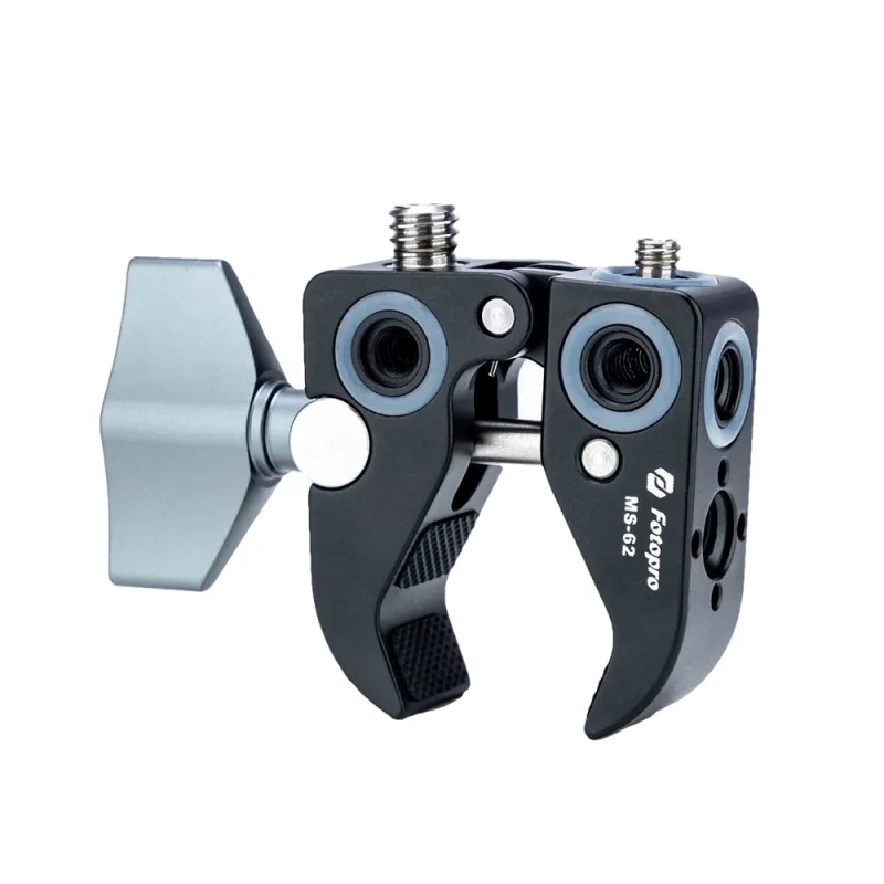 The Fotopro MS-62 Clamp is a universal, portable and stable clamp. The clamp has a maximum load capacity of 18kg, has 8 screw holes for extensions (6x1/4" and 2x3/8") such as for clamping to the table, bike or to your tripod. It is therefore multifunctional in use.