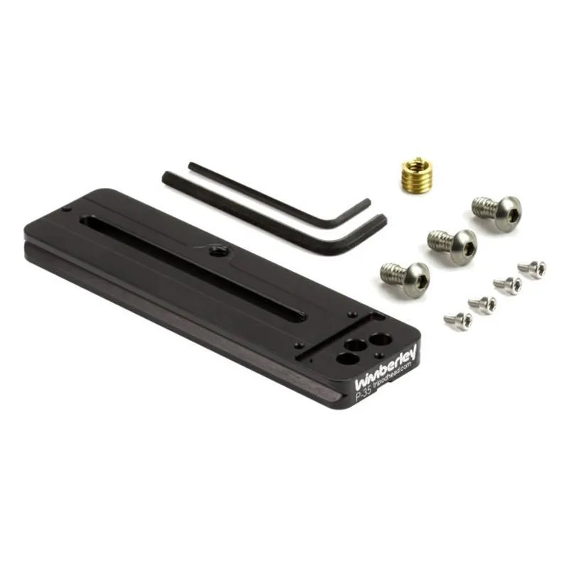 The P-35 is a 5,00” long, double dovetail, Arca-Swiss style quickrelease plate. It is used to connect a camera lens, fitted with both a rotation collar and tripod mounting foot, to a compatible quick-release clamp. Wimberley plates are compatible with most Arca-Swiss style quick-release clamps, such as those made by Wimberley, Really Right Stuff, Kirk Enterprises, Markins, Arca-Swiss, Foba, Graf and others.