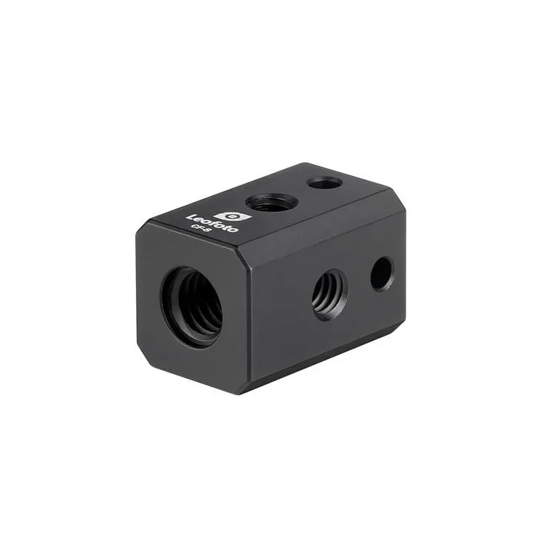 The CF-8 Multi Adapter is a small rectangular cube featuring UNC inch threads on each side, allowing for the mounting of accessories with UNC inch screw holes. It attaches to tripods using a 3/8-inch screw hole on the bottom, which can be converted to a 1/4-inch screw hole with the included thread adapter, enabling compatibility with mini and table tripods.
