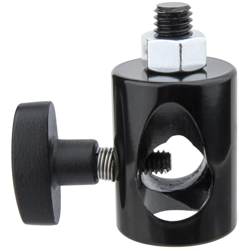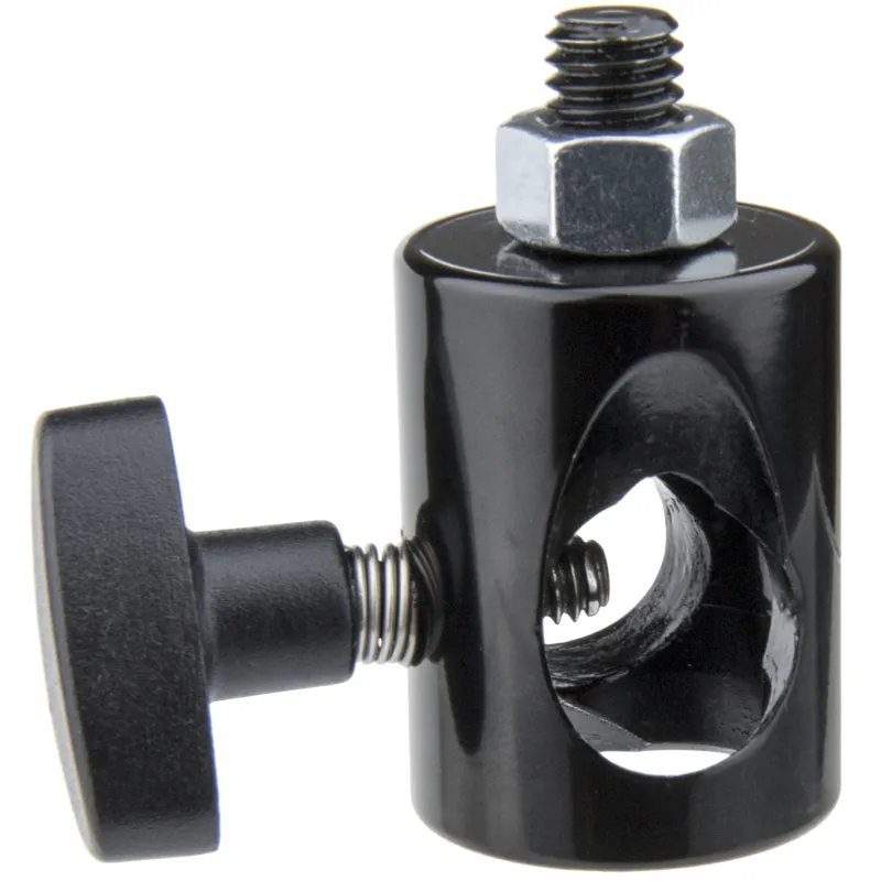 Made of steel with a black coating, this unique locking adapter for 5/8 (16mm) light stands allows for both vertical and horizontal mounting of lighting, flash, or cameras that have 3/8-16 male threads.