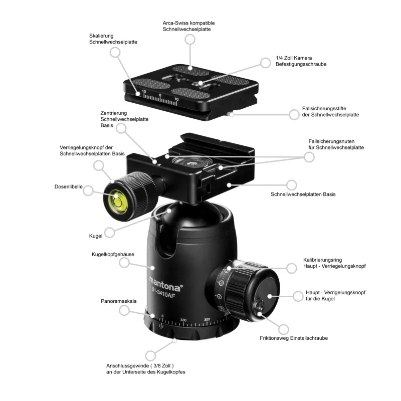 Both controls for the quick-release plate clamp and the panorama function are made from aluminium and ensure optimum operation and an attractive look.