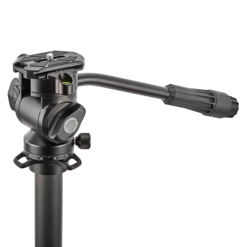 The detachable panning arm can be adjusted with a dedicated wing knob, and the head includes leveling levels in both the base and clamp.