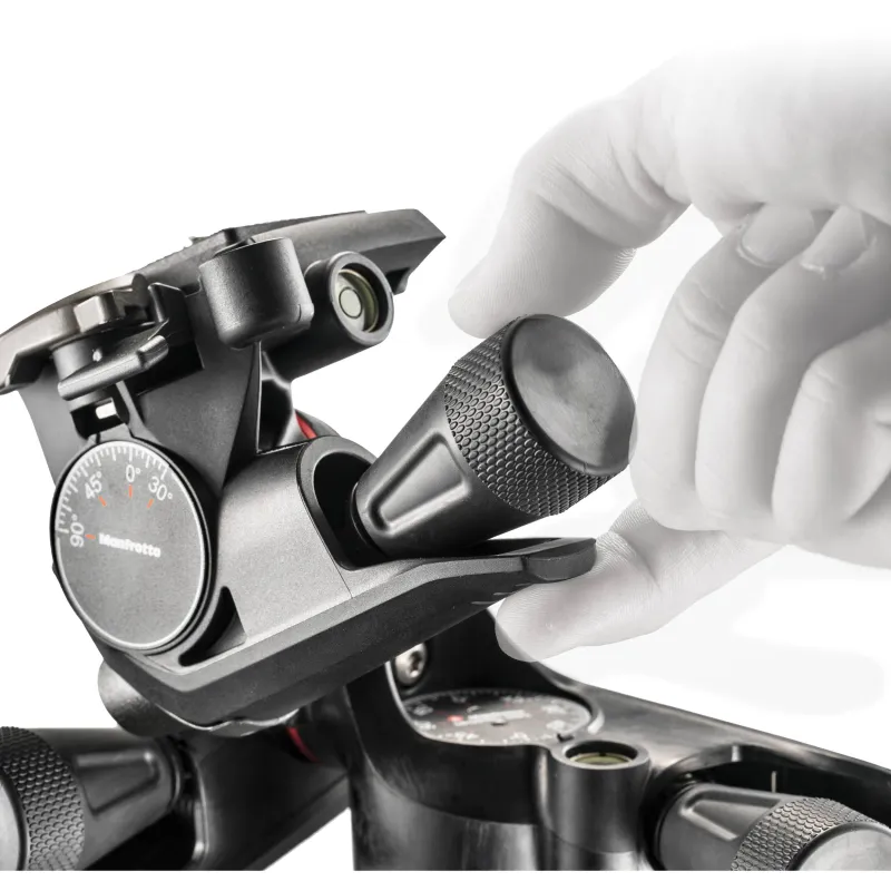 The head features micrometric knobs, allowing you to place your camera exactly where you need it. For larger adjustments the knobs can be pressed down against a lever, unlocking the movement of each axis individually. The head has a front tilt range of -20° / +90°, a lateral tilt range of -90° / +30°, and a 360° pan range. A 200PL quick-release plate is included for fast and easy camera attachment and detachment.