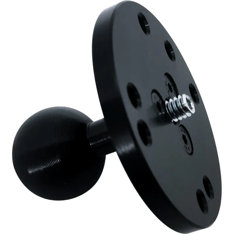 This aluminum-made round plate with a ball head features 7 holes, allowing the base to be rotated to suit the rectangular or diagonal configuration of the AMPS hole pattern. It includes a 1/4-20 threaded male connection, making it easy to connect with any equipment that comes with a 1/4-20 threaded female fitting.