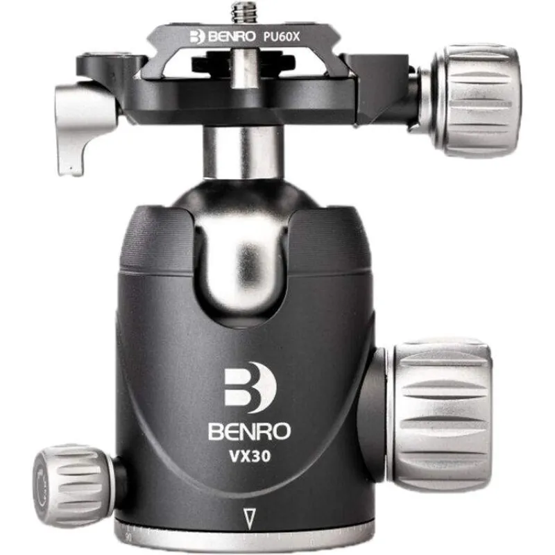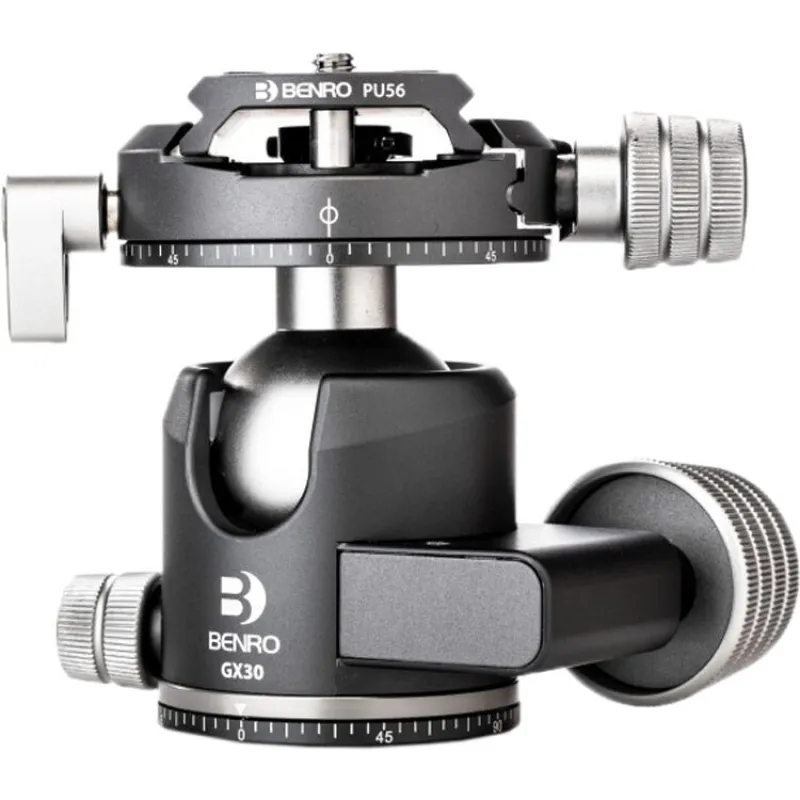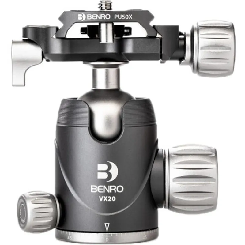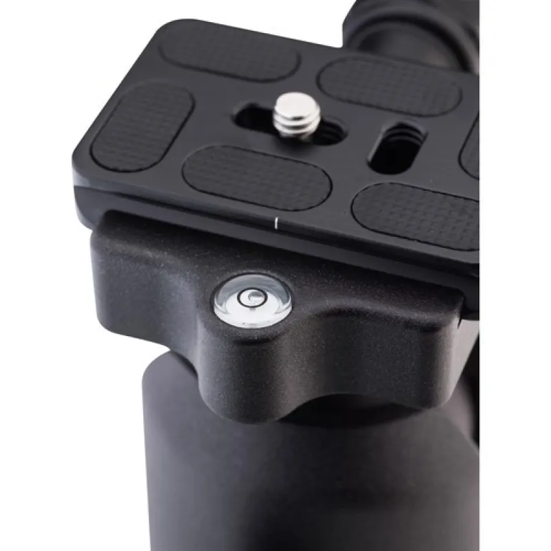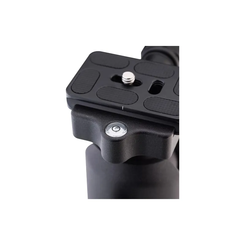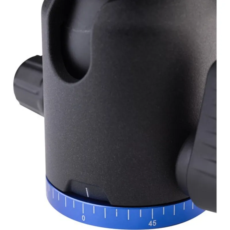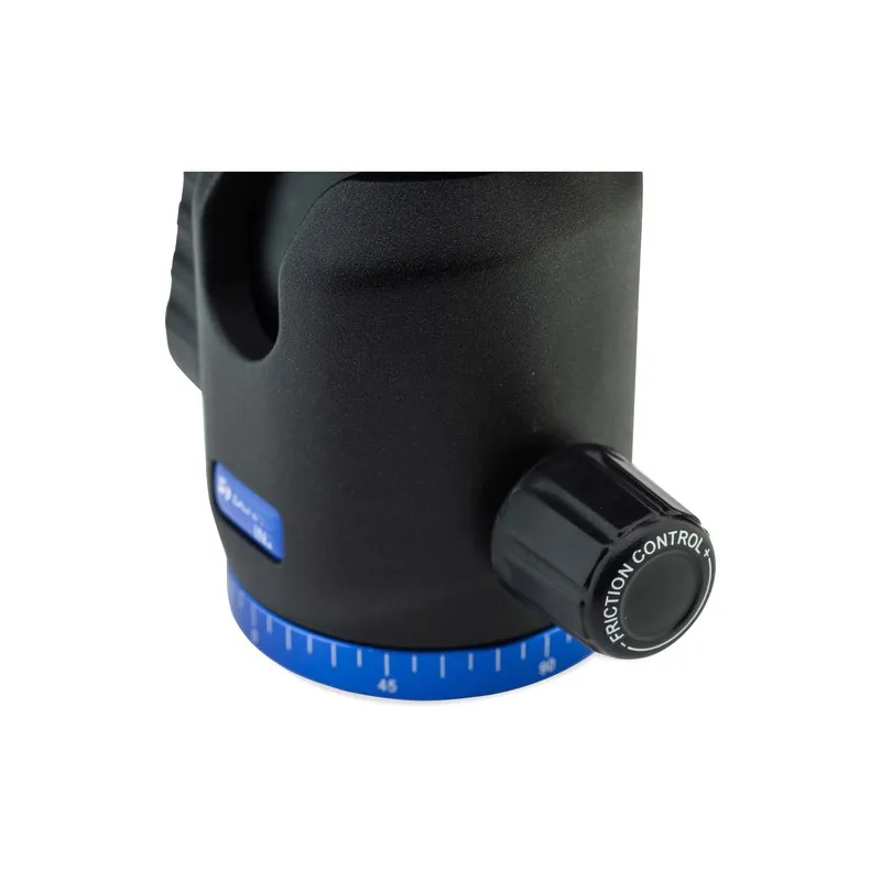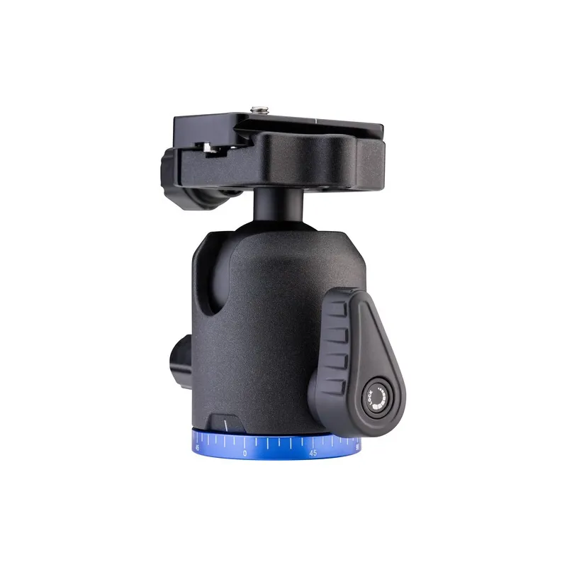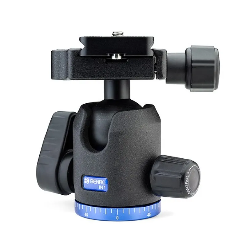 The IN0 Double Action Ball Head from Benro has an Arca-type compatible quick-release system with an included PU50 QR plate. It can hold up to 13 lb, stands 3.1" high, and weighs 11.2 oz. A large locking knob controls the ball's motion and the 360° panning, and a separate knob adjusts the friction control. A numbered scale on the base helps you accurately repeat pans, and a bubble helps ensure that the head is level to the horizon.