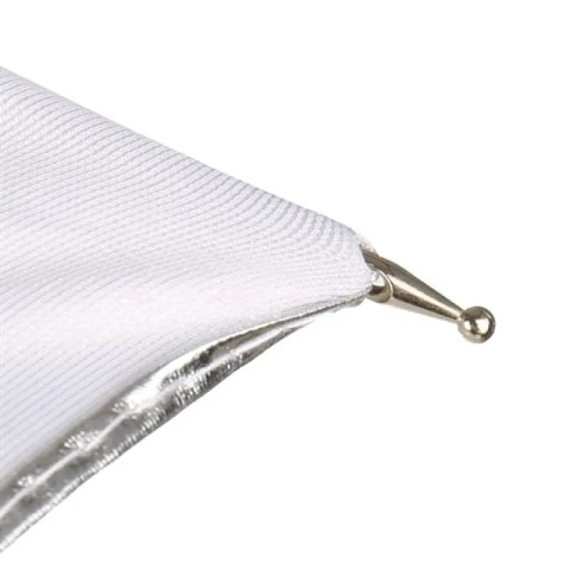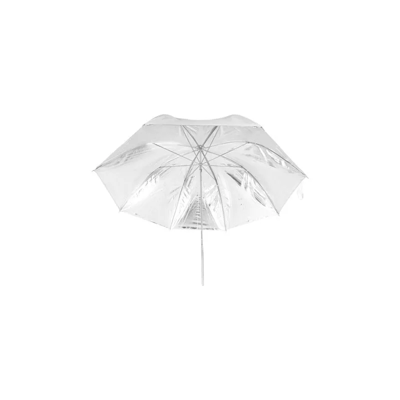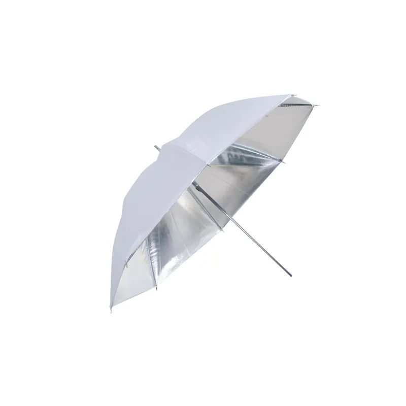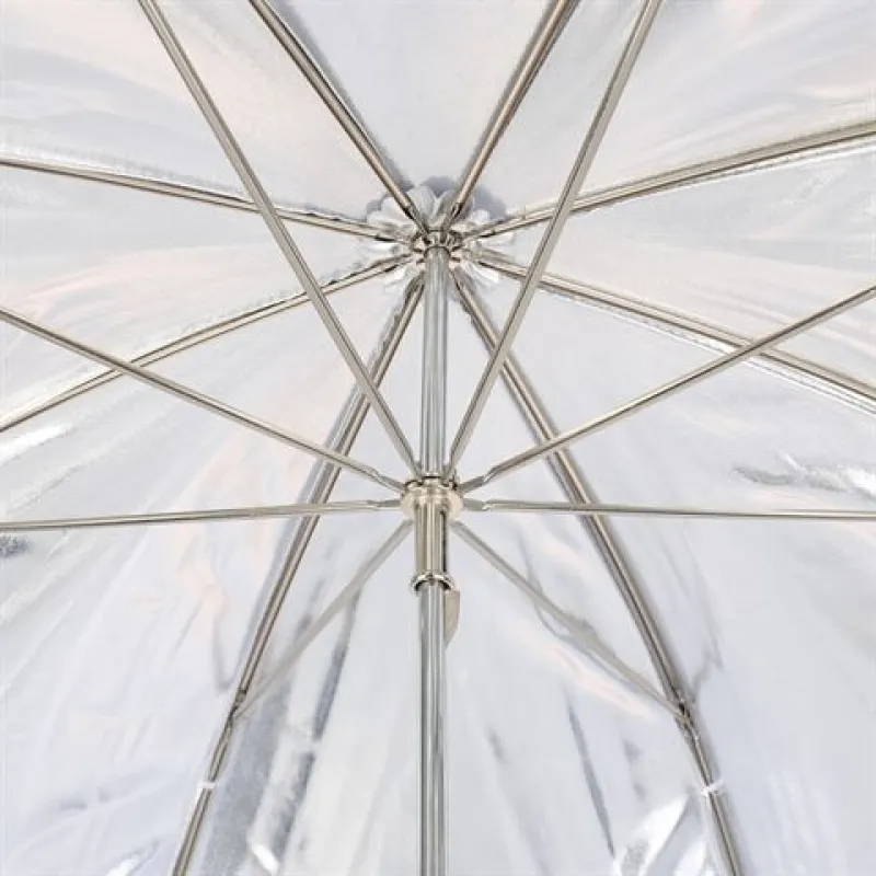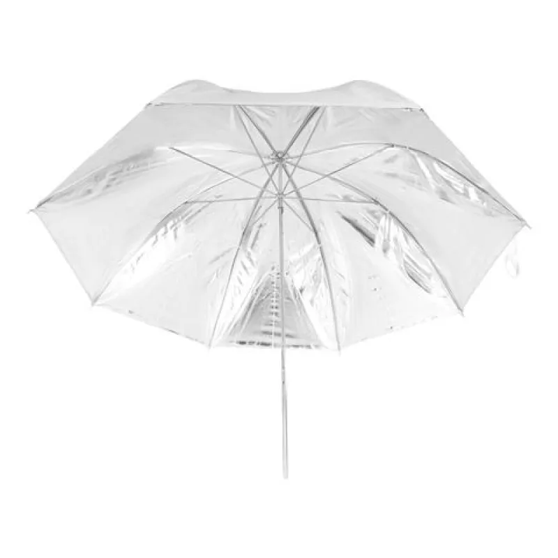 This Falcon Eyes UR-48S flash umbrella has a silver interior coating and a white exterior fabric. An umbrella with a silver coating inside reflects fairly hard light.