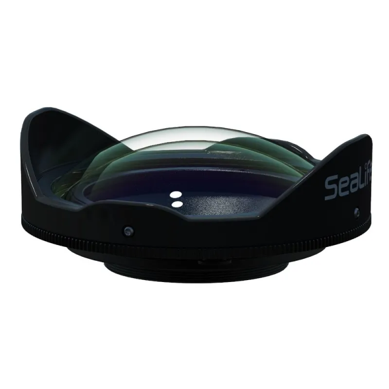 The SportDiver Wide Angle Dome Lens is a wet lens and easily attaches and removes underwater. A locking ring prevents the lens from accidentally detaching when bumped or in rougher water conditions. The lens weighs 11.6 ounces (329 grams) and is negatively buoyant. A lanyard is included to prevent loss underwater, the lens threads on to the SeaLife SportDiver Lens Adapter (SL081). The rotatable light shade prevents unwanted glare from external lighting or sunlight, as well as protect the dome lens from bumps and abrasion.