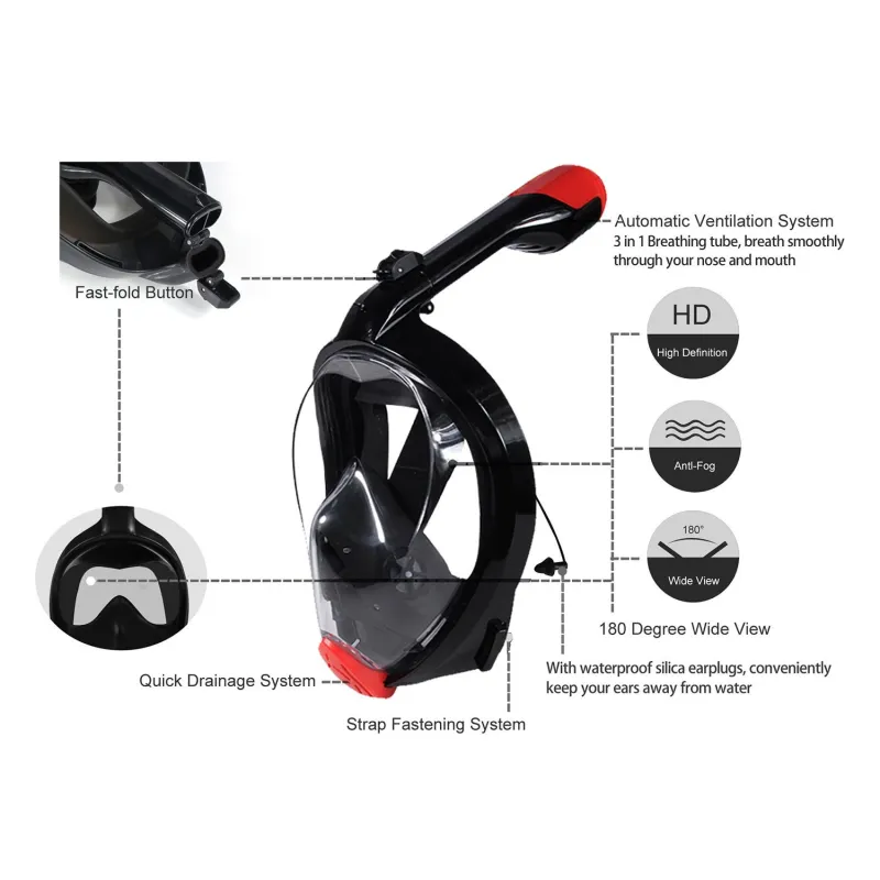 Caruba Full Face Snorkel Mask Swift - Foldable + Action Cam Mount (Pink - L/XL) The Caruba Full Face Snorkel Mask offers a new snorkeling experience! This mask covers the entire face, allowing for breathing through both mouth and nose. The anti-fog mask offers a wide viewing angle of no less than 180 degrees, making the underwater view even more spectacular.