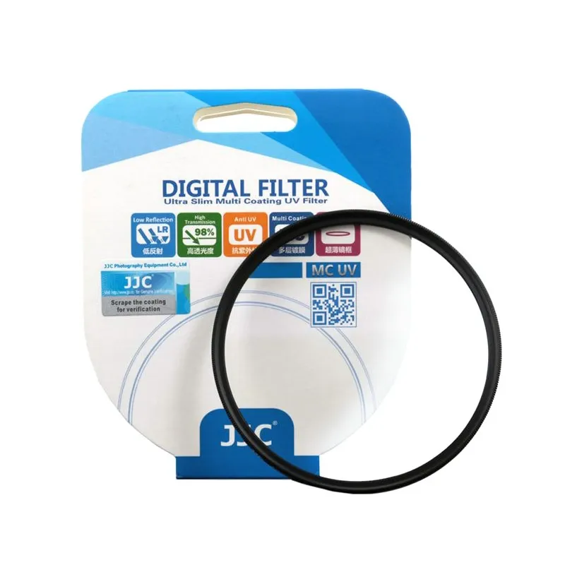 The JJC UV filter is made of optical glass surrounded by a sturdy aluminium frame. The special multi-coating helps to prevent unwanted reflections, lens flares and shadow images. The coating also improves light transmission. Many photographers choose to leave a UV filter on a lens at all times, but when shooting at night it is better not to use the filter because of the reflections that can occur.