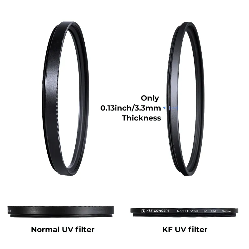 The K&F Concept Classic HMC UV filter is a must-have for photographers, offering protection and enhancing photo quality. The filter features a Hard Multi-Coated (HMC) multilayer coating and Japanese optical glass to reduce reflections and glare, improving contrast and clarity. The ultra-thin 3.3mm frame prevents vignetting, and it comes with a protective case for transport.
