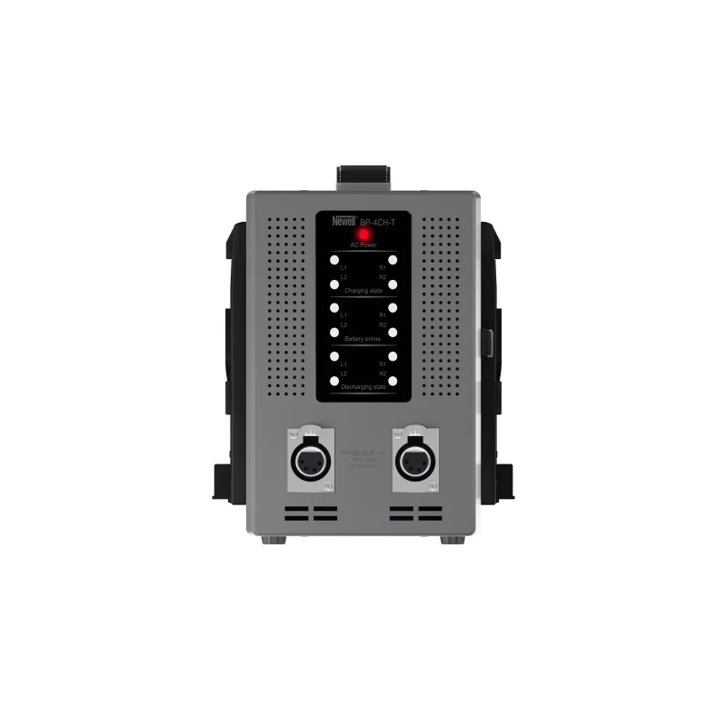 The Newell BP-4CHT quad-channel charger is a professional device that allows you to charge up to 4 V-mount batteries simultaneously. This standard is increasingly popular in the film and photography industry, not only among professionals. The device features a state-of-the-art MCU (Micro Controller Unit) that regulates the optimum parameters of the charging process, protects the cells, and ensures maximum service life. Powerful locks allow for comfortable placement of the batteries in the charger. The Newell BP-4CHT also allows 2 different devices to be powered directly from the charging station (XLR socket) into which the V-Mount cells are plugged. The charger is equipped with an ergonomic handle and LEDs indicating the operating status.