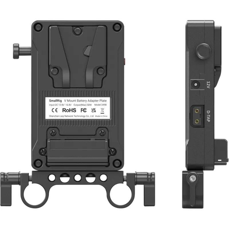 SmallRig V Mount Battery Adapter Plate (Basic Version) with Dual Rod Clamp 3498 is designed to provide greater battery life to your camera rig via a V mount battery. Its standard quick-lock V mount supports most V mount batteries. Output ports, including an 8V DC port, a 12V DC port, and two 14.8V D-Tap ports, work with a V mount battery to power your camera and other equipment (e.g. monitor, transmitter, follow focus, mobile phone, etc.). It features a power switch that controls all of the output ports more quickly and conveniently and comes with a 15mm dual rod clamp that suits a 15mm rail support system. In addition, multiple 1/4”-20 thread holes allow attaching other accessories such as super clamp mount and magic arm.
