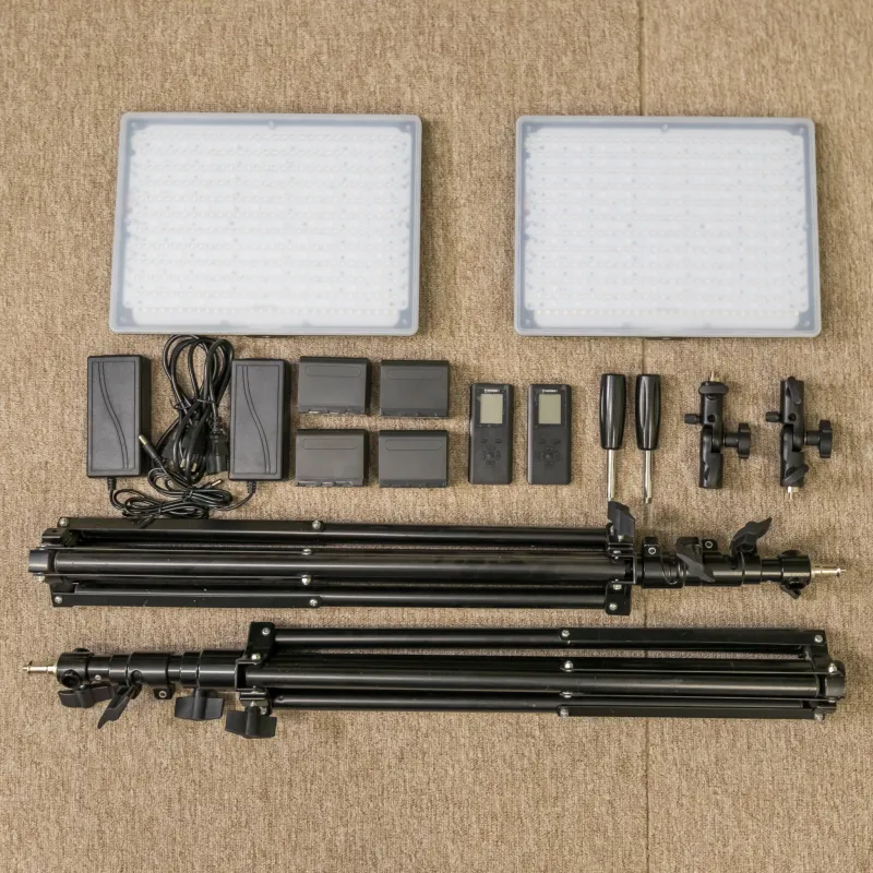 Komplekts sastāv no diviem LED paneļiem, statīviem un 4 akumulatoriem NP-F960 Li-ion Sony type 6600mAh .