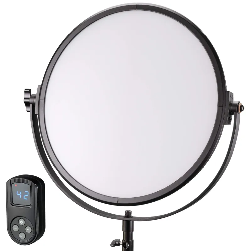 The compact and round BRESSER BR-S200B Bi-Color Soft LED lamp is a valuable asset for photographers and videographers. Whether in the studio or on location, the powerful 200 W Bi-Color Soft LED lamp achieves optimal results in portrait photography. Quickly stowed away in the transport bag, it is the perfect companion for bloggers and vloggers.