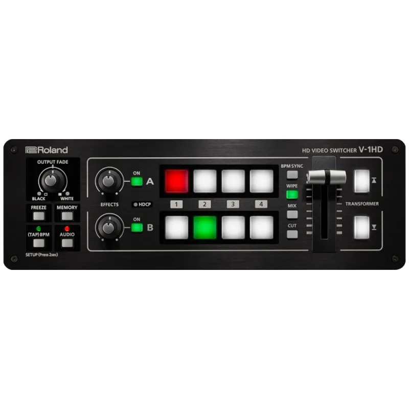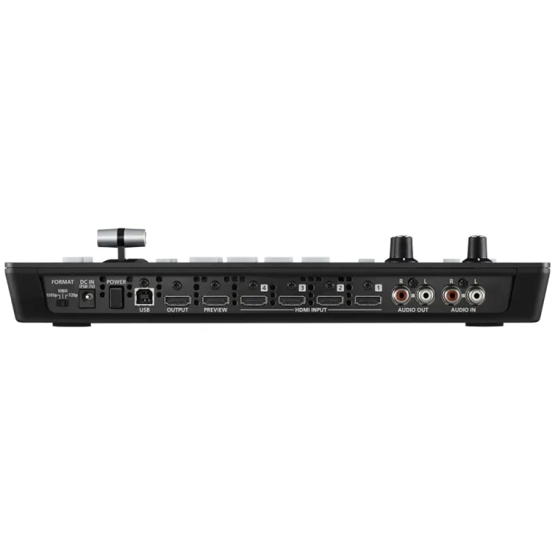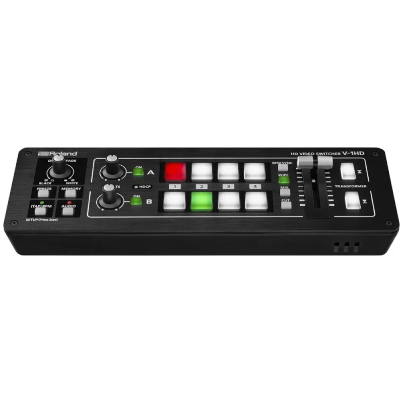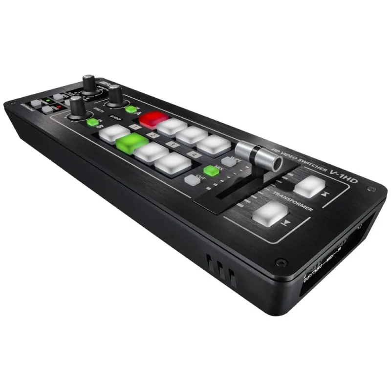 Roland's V-1HD+ Compact 4 x HDMI Video Switcher is a portable solution for HD video production that accommodates up to four HDMI inputs, as well as PC resolutions over one of the inputs. Each input has a frame buffer/TBC and supports frame rate conversion, so you don't need to genlock your input sources together. You can control the switcher manually by using the built-in controls or remotely via RS-232, and it has a tally output for working with live cameras. Select your working resolution and switch between four input sources. Built into the switcher is a 14-channel audio mixer that can de-embed and embed audio signals from HDMI.