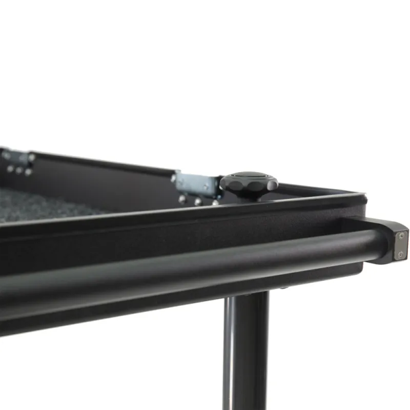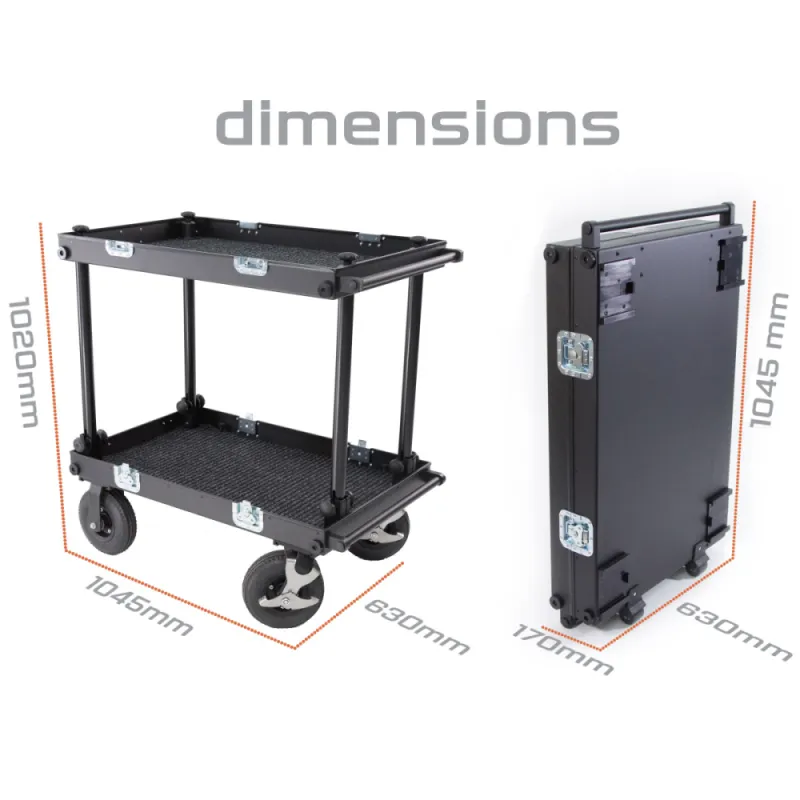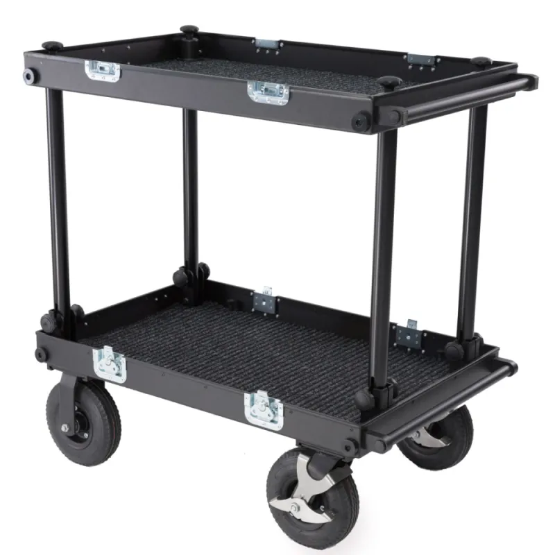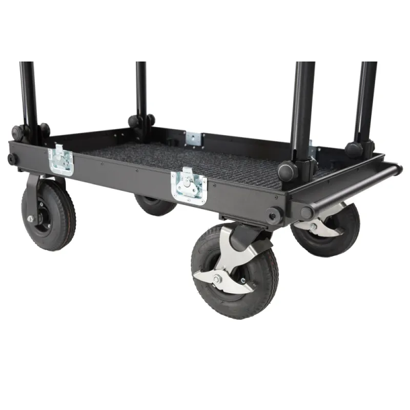 Professional folding transport trolley dedicated to the film industry. The maximum capacity of 200 kg allows fast transport of large quantities of equipment at one time. 220mm diameter pneumatic wheels and two brakes ensure comfortable and safe transport. The carpet surface on both levels ensures that small parts on the filmcart do not slip back and forth during driving.