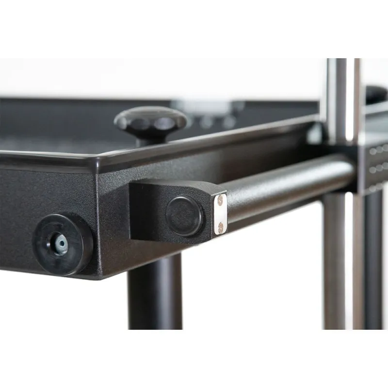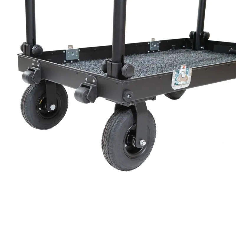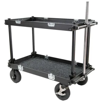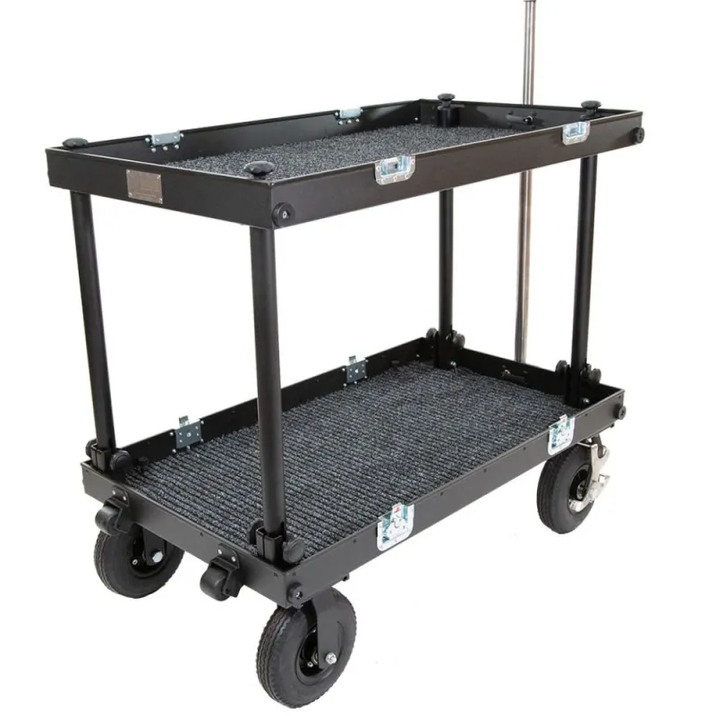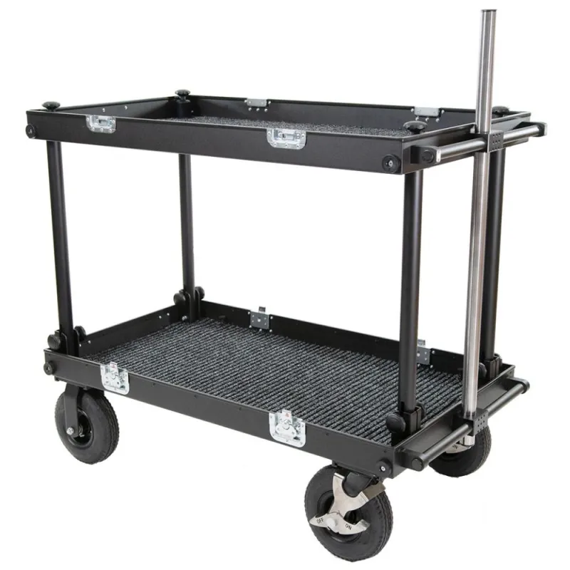 Double deck cart can be used to transport equipment or as a workstation, all parts can be transported in one case including the accessories.