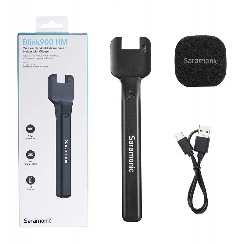 The Saramonic Blink900 HM Handheld Mount for Transmitters is a revolutionary device that will easily transform the Blink900 TX microport into a reporter microphone. The clip-on mount allows you to connect accessories in a second. The ergonomically designed handle will be great for interviews, live coverage, events, and conferences. The built-in rechargeable battery will allow you to charge the Blink900 TX transmitter twice.