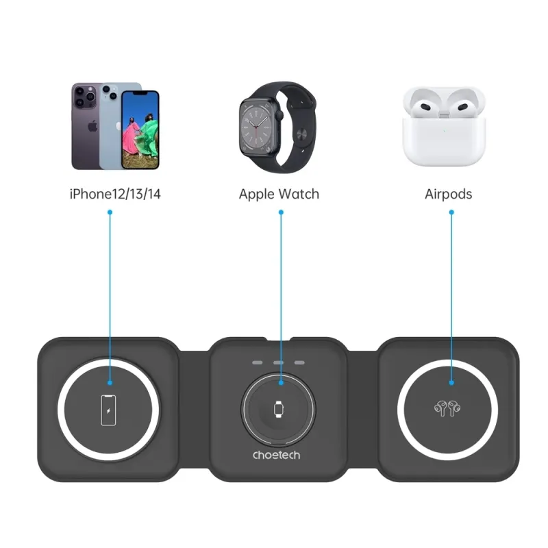 All in one wireless charging The Choetech 3 in 1 Foldable Magnetic Wireless Charging Station T588 F (Black) wirelessly charges your iPhone 12 / 13 / 14 series, Apple Watch and AirPods at the same time. And its foldable design makes it very easy to carry around. It can also serve as a practical stand for your smartphone.