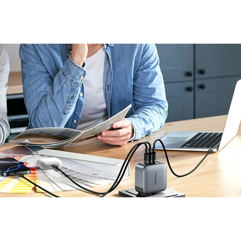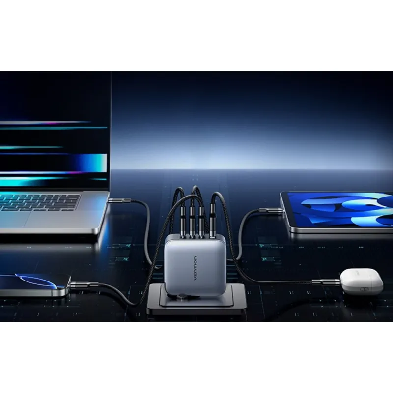 The Vention TZ-FET-EU is a mains charger that uses GaN V technology to achieve up to 100 watts of power with reduced device dimensions. Compared to a standard 96W charger, it is up to 20% smaller. It can quickly charge devices such as the MacBook Pro (36% in 30 minutes), iPhone 16 Pro (54%), iPad Pro (45%), and Samsung S24 Ultra (65%). It comes with a heavy-duty USB-C to USB-C cable with a length of 1m and a maximum power output of 100 watts.