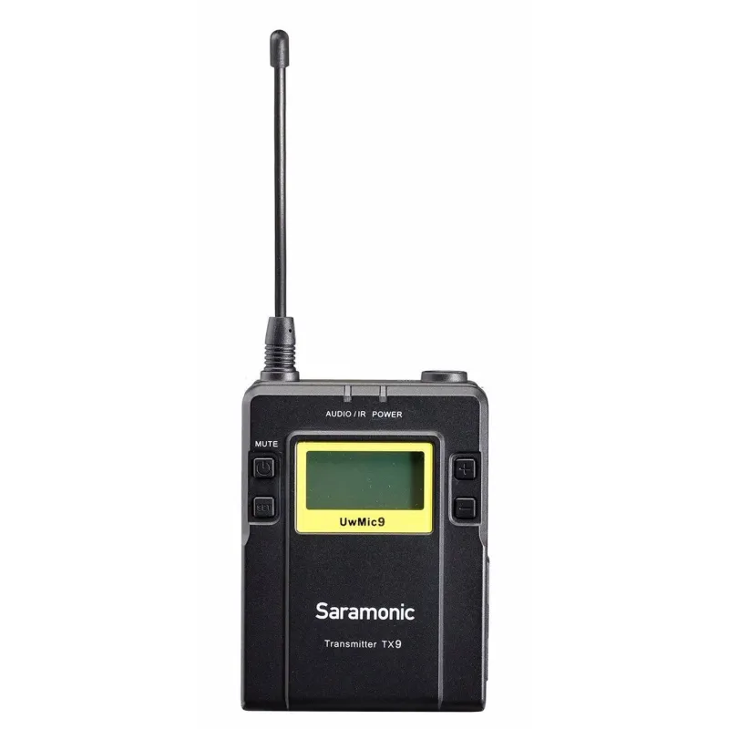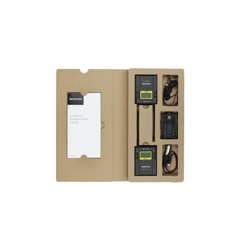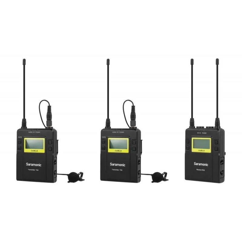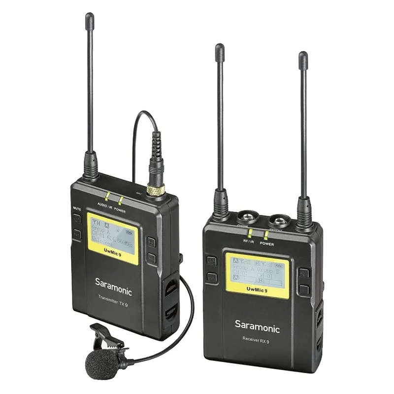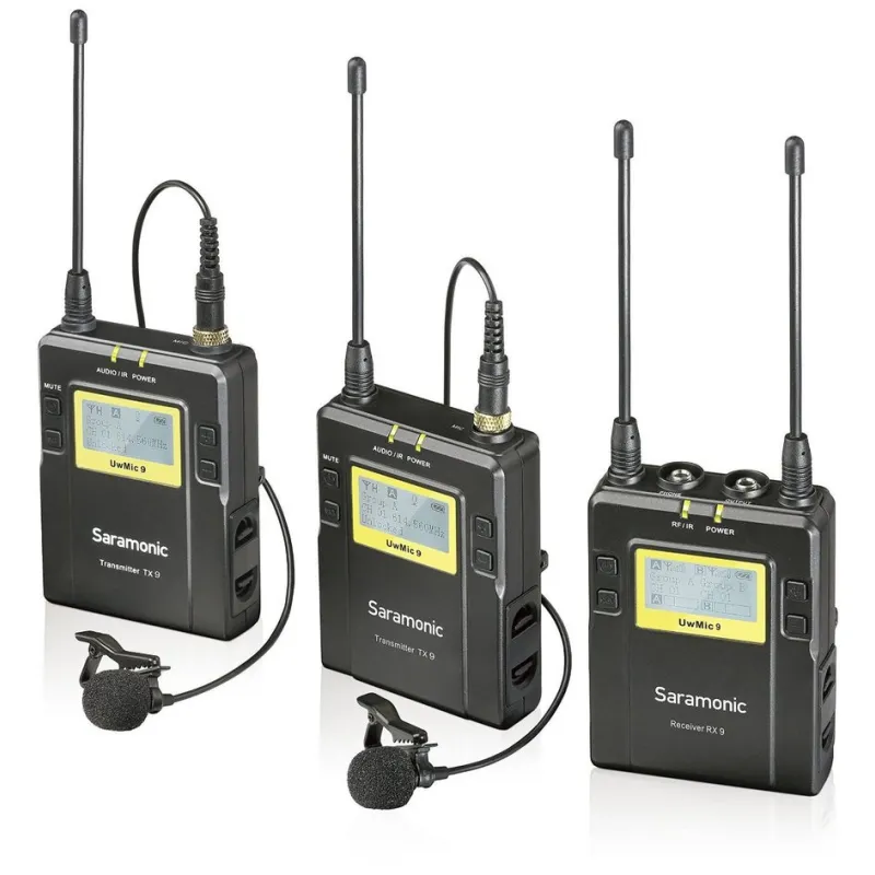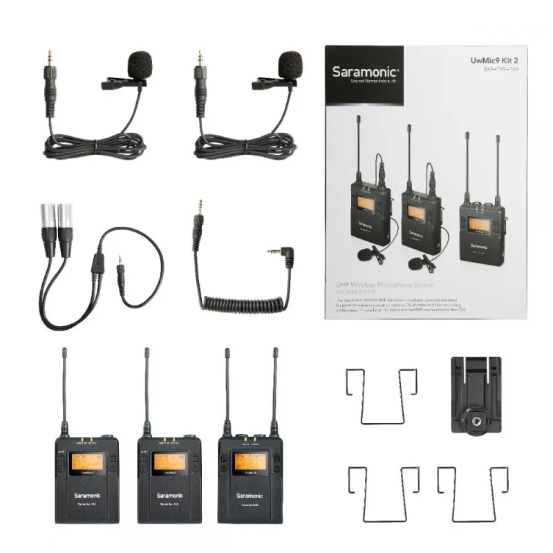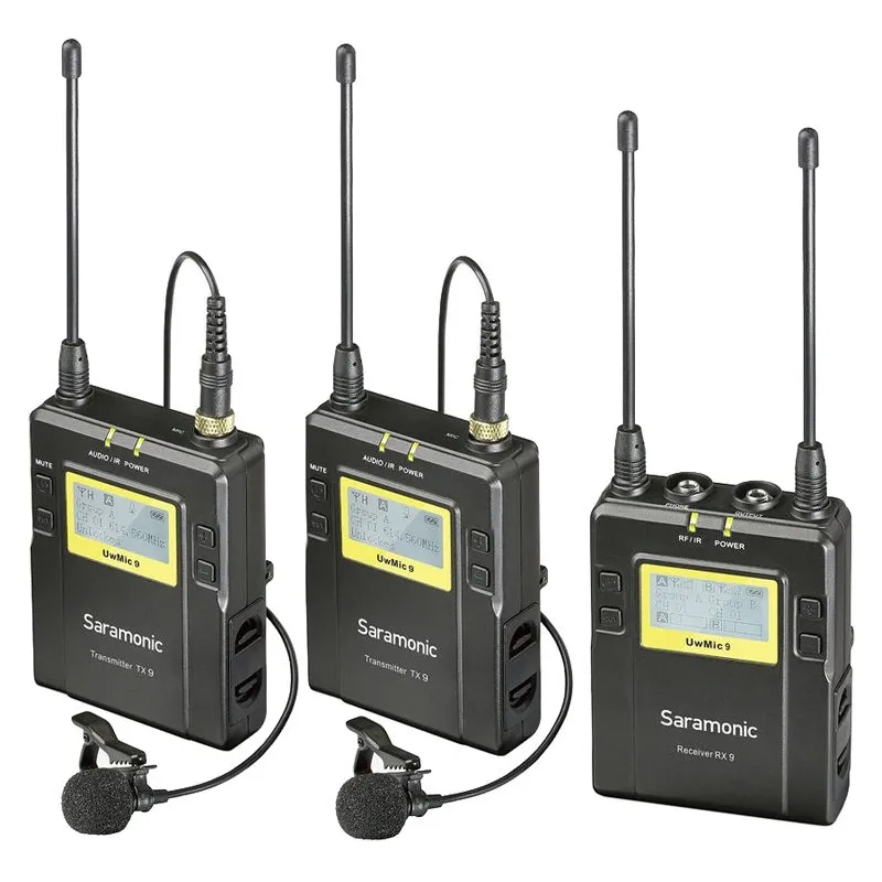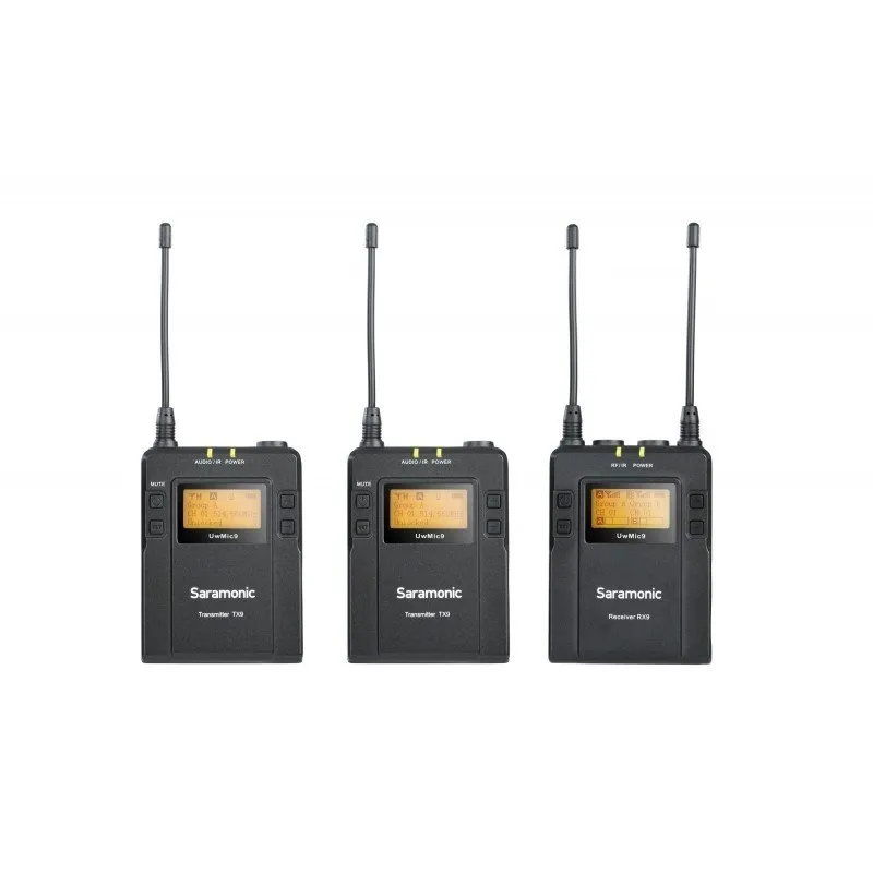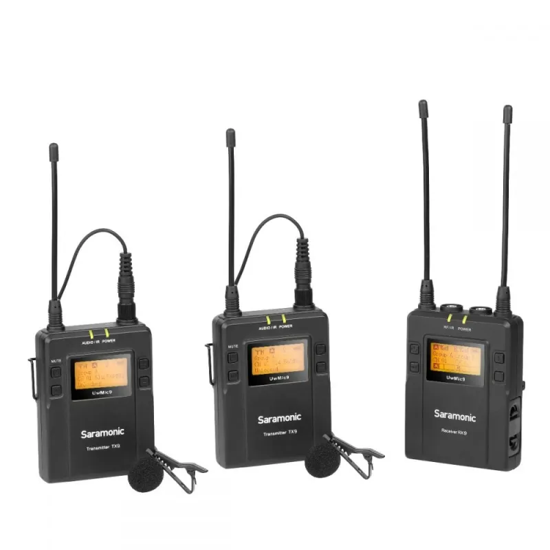 The Saramonic UwMic9 Kit 2 (RX9 + TX9 + TX9) is a receiver and two transmitters with tie microphones that form part of a UHF wireless transmission system in the analogue frequency range from 514 MHz to 596 MHz.
