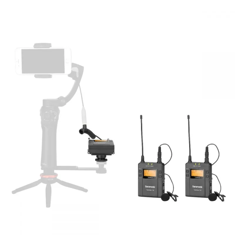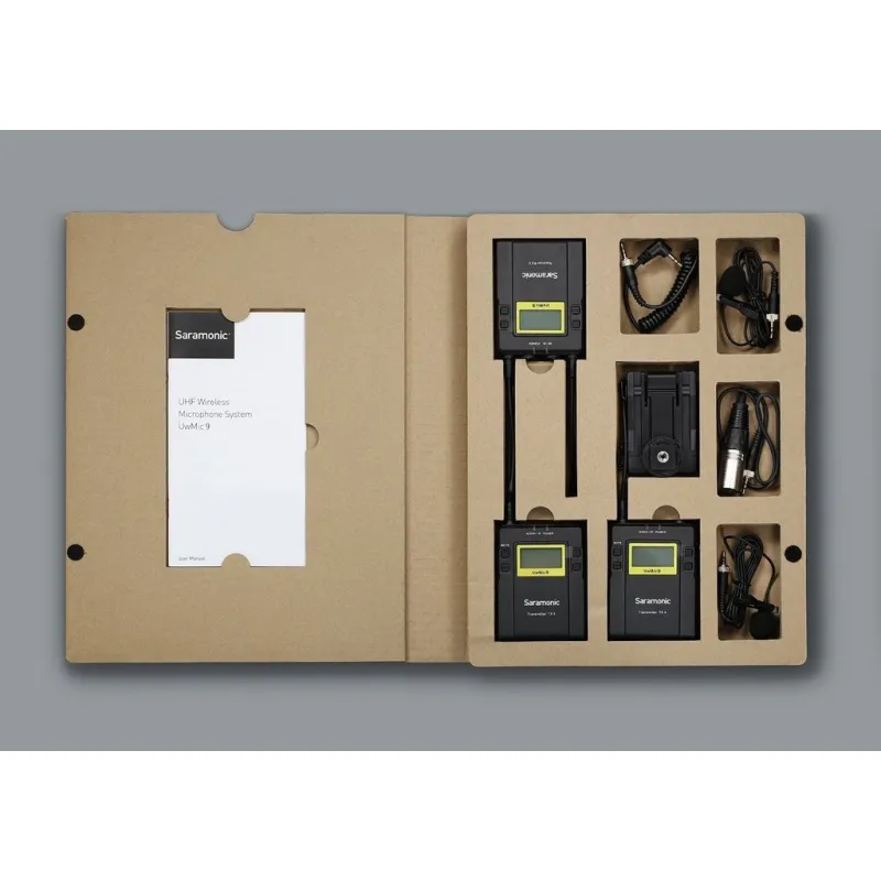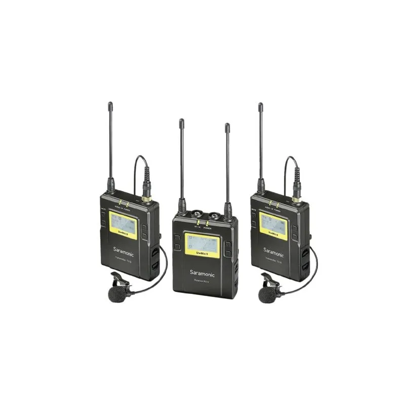The Saramonic UwMic9 RX9+TX9+TX9 UHF Wireless Lavalier Microphone System provides stable, interference-free audio in a portable, compact, and low-cost package. UwMic9 RX9+TX9+TX9 supports two transmitters and one receiver working simultaneously, making it a perfect fit for DSLR videography, field recording, interviews, broadcast TV, and ENG, providing dependable audio broadcasting and recording.