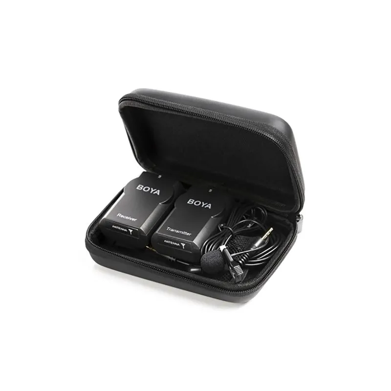 Boya's WM4 Pro is a low-cost transmitter set for recording sound during presentations, interviews and conversations. There are two versions of the WM4 Pro: K1 and K2. Currently you are watching the K1, which comes with one transmitter + lavalier microphone. With the K2 you will receive two transmitters and lavalier microphones. The transmitter and receiver of the WM4 Pro are very compact and connect to each other on the 2.4 GHz frequency. You can easily connect the receiver to your smartphone, (DSLR) camera, PC, laptop or MacBook. Both a 3.5 mm TRS and TRRS cable are included. For devices without a 3.5 mm input, a Lightning adapter and a USB adapter are available. These are included with the optional accessories.