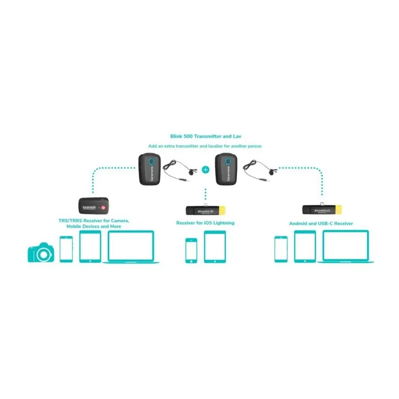 The Saramonic Blink 500 B2 is an incredibly compact, lightweight, and easy-to-use 2-person wireless microphone system for DSLR, mirrorless and video cameras, or mobile devices that delivers detailed, broadcast-quality sound.