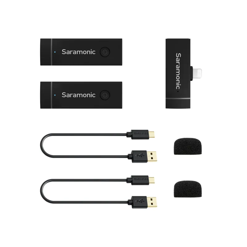 The Saramonic Blink Go-D2 Wireless Audio Transmission Kit was created specifically for creators using Apple mobile devices (Lightning connector). It will be an ideal choice for youtubers, vloggers, journalists and people who do live broadcasts. In the set you will find 2 Blink GO TX transmitters and 1 Blink GO RXD receiver. The automatic pairing system will get you set up quickly and conveniently. Intelligent noise cancellation and 360º omnidirectional microphones will ensure excellent sound quality. The iPhone or iPad you connect the receiver to can be charged while recording via an additional USB-C port. The audio transmission range is 50 metres. Suitable charging cables and wind shields are not missing from the package.