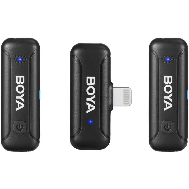 The Boya BY-WM3T2 series is a mini 2.4 GHz wireless microphone system that provides high-quality sound for live streaming, vlogging, course recording, and other audio capturing applications. With an MFi Certified Lightning output, the BY-WM3T2-D2 is designed for Apple iOS devices, and it comes with 2 transmitters and 1 receiver. The difference between BY-WM3T2-D2 V2.0 version and BY-WM3T2-D2 V1.0 version is that the V2.0 version adds charging contact which allows you to charge it with a charging case (not included).