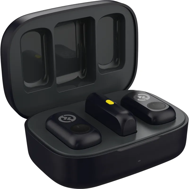 Battery life is excellent; each transmitter runs for up to 9 hours on a full charge. The included compact charging case delivers up to two full recharges, giving you a total of around 27 hours of use.