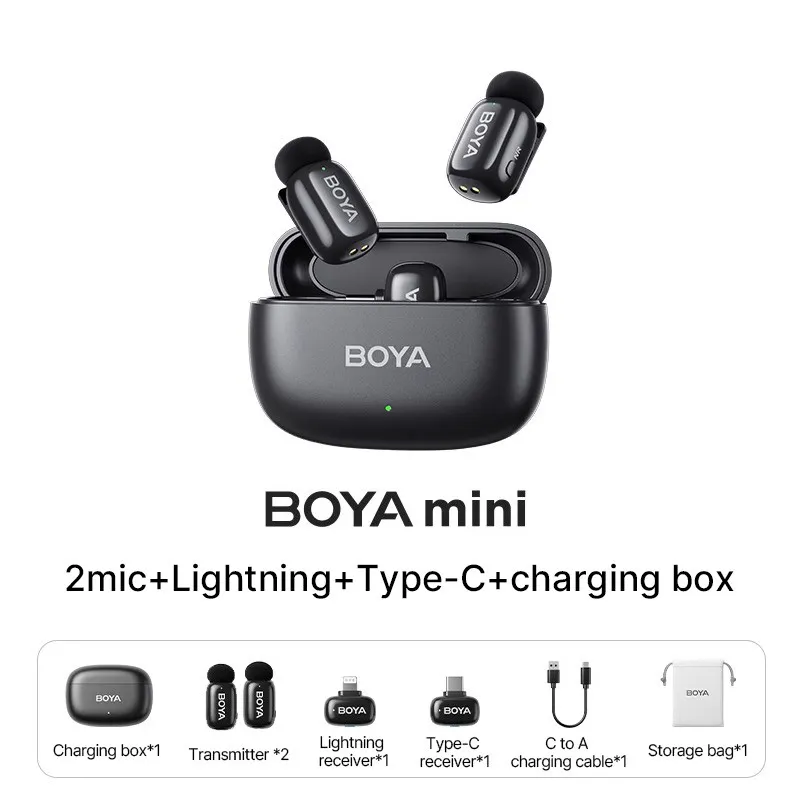 The Boya mini-12 kit is perfect for recording with a variety of smartphones, tablets and computers. The kit includes two transmitters, one Lightning receiver for iOS devices, one USB-C receiver for smartphones and computers with a USB-C connection, and a charging case that provides up to 30 hours of battery life.