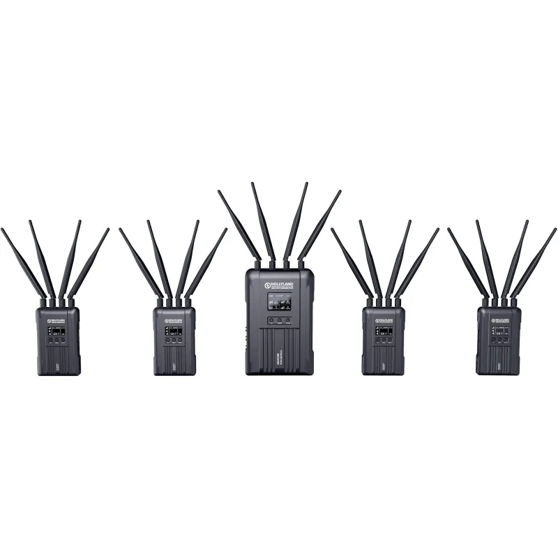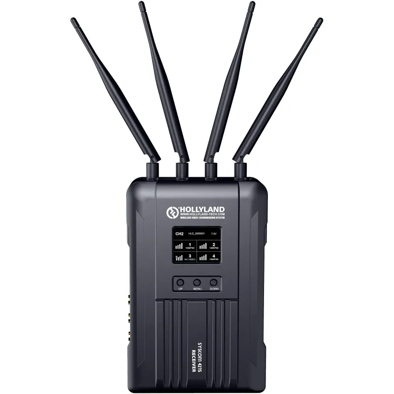 The Syscom 421S 4-Transmitter 1800' A/V Transmission System with Carry Case from Hollyland is a multi-cam wireless video transmission system that communicates with up to four cameras using a single receiver with PTZ control as well as tally. Supporting up to 1080p60 video signals via SDI and HDMI, the transmitter/receiver system offers an 1800' line-of-sight transmission range with 0.07 second latency. The 421S system also supports Ethernet pass-through, so you can stream directly via RTSP to the Internet.