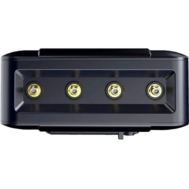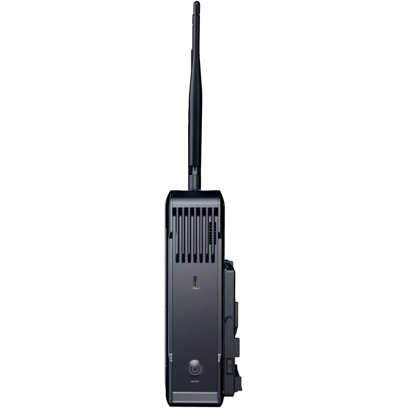 The receiver features four SDI and four HDMI outputs (one for each transmitter) for connecting to a monitor or switcher. You can control PTZ cameras via IP or RS-422/485 serial connections. The transmitters have a dedicated tally output port that support optional tally lights. Both units also have an OLED display that confirms the resolution, transmission channel, signal strength, and other details such as battery power. Each transmitter has an L-series battery plate, and the receiver has a V-mount battery plate. Both Transmitters and receiver also feature a 2-pin power input for alternate DC power options.