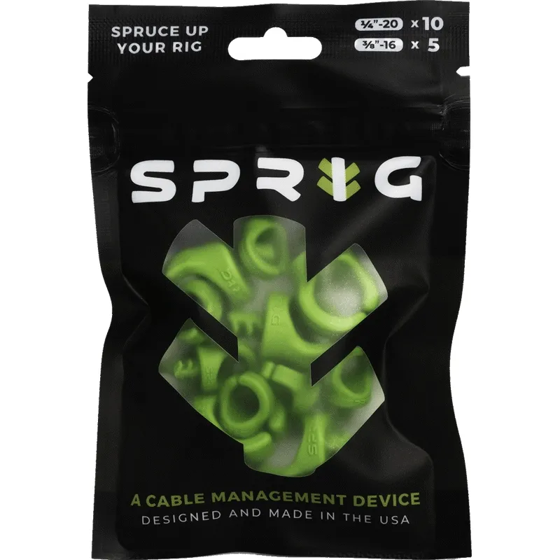 The Sprig Value Pack includes 10 original 1/4"-20 Sprig cable management clips as well as 5 of the 3/8"-16 Big Sprigs in a resealable zippered pouch.