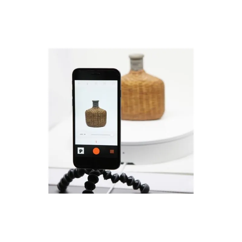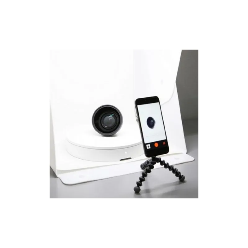 You can download the Foldio360 app on your iPhone or Android smartphone. The Foldio360 automatically connects with your smartphone, you don't even have to open the Bluetooth settings. You can place your smartphone on a tripod and then you are ready to make your first 360 object. With the app you can control the turning speed (1x, 2x, 3x), turning direction, brightness of the Halo Edge, brightness of the camera shot, white balance and the number of pictures (24, 36, or 48). When you press the shutter button, the Foldio360 will turn around and make pictures in the selected number of steps.