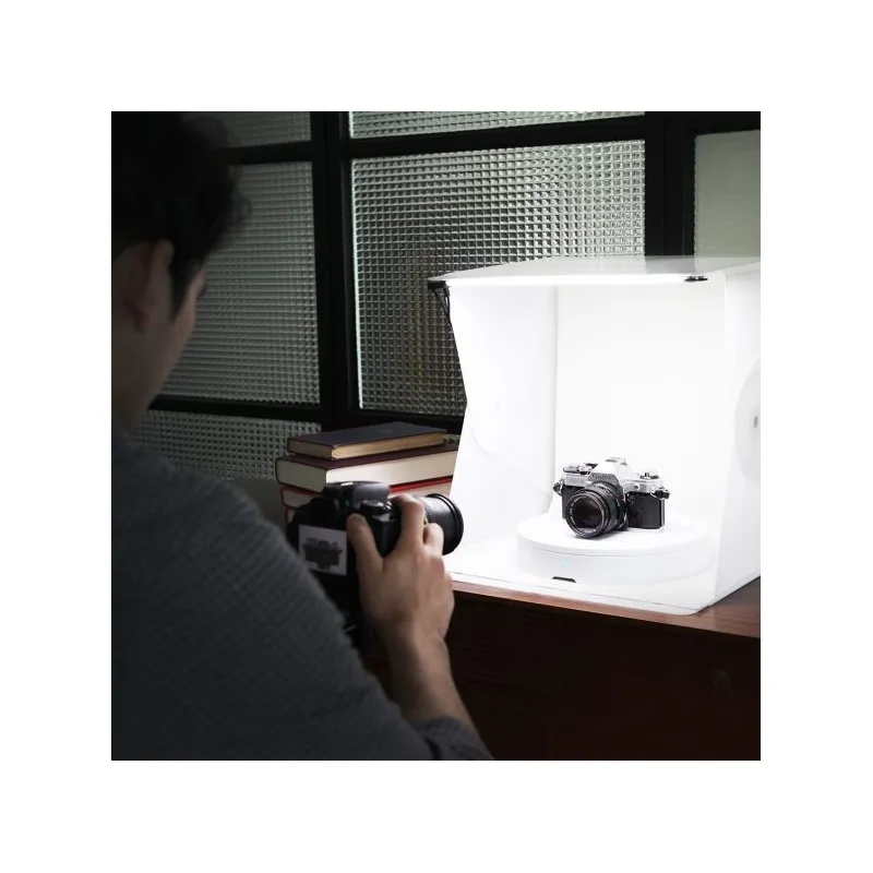 To achieve an equal white background, you can place the Foldio360 in a photo tent (not included). On the backside of the Foldio360 you can find a 5700K Halo Edge LED light, which makes sure there is a seamless transition between the turntable and the background of the photo tent.