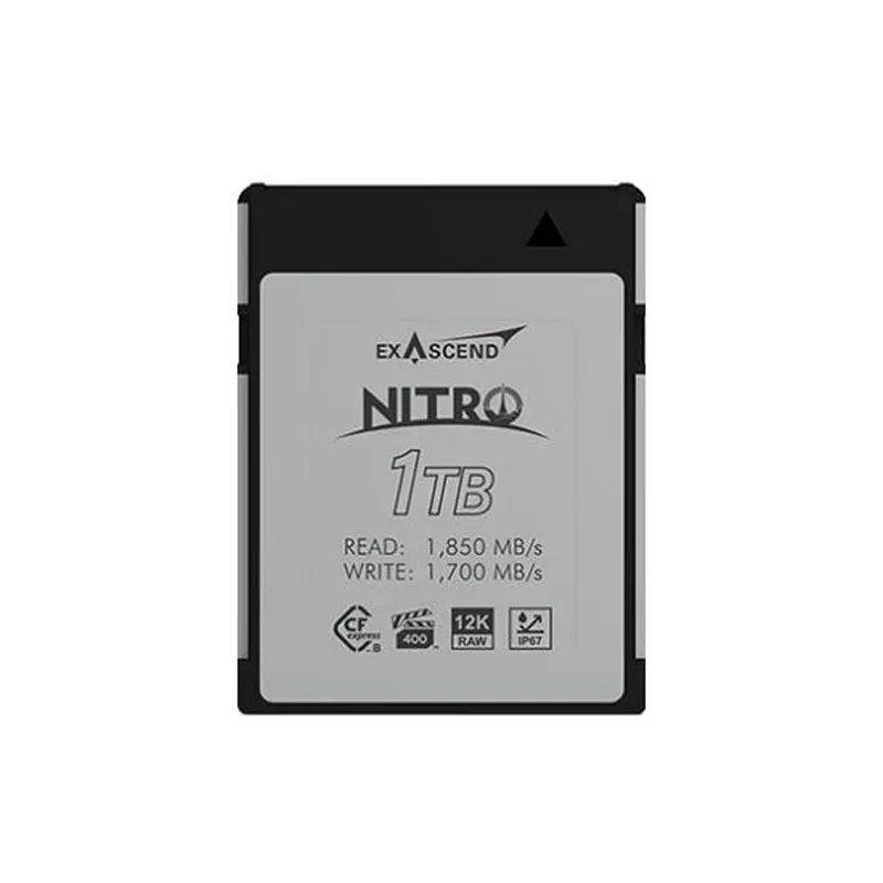 Engineered for discerning cinematographers, the 1TB Nitro CFexpress Type B Memory Card from Exascend IP67 is certified and uses a next-gen CFexpress controller, so it delivers performance and ruggedness for tough shots. This card features a storage capacity of 1TB, NAND flash memory, and utilizes the PCIe 3.0 / NVMe 1.2 interface to achieve maximum read speeds of 1850 MB/s and top write speeds of 1750 MB/s. Thanks to its VPG-400 rating, write rates are guaranteed not to drop below 400 MB/s. This card also delivers an MTBF of 2 million hours, a Total Bytes Written (TBW) rating of 300TB, an Unrecoverable Bit Error Rate (UBER) of 1 sector per 1017 bits read and is resistant to temperatures ranging from 14 to 158°F. It is also IP67-rated and resistant to water and dust. Also featured are Adaptive Thermal Control, SuperCruise, Conformal Coating, RAID ECC, and more.