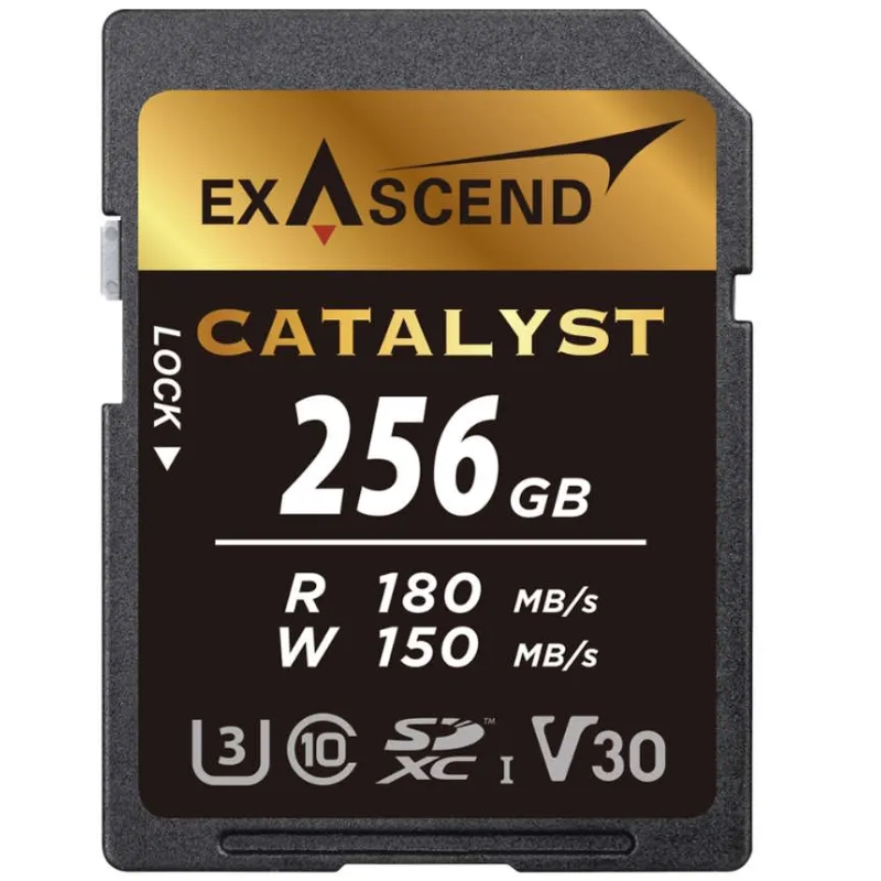 Designed to excel in professional photography and high-end cinematography, the 256GB Catalyst UHS-I SDXC Memory Card from Exascend lets you keep up with extreme resolutions and rapid-fire shutter bursts. This card features a storage capacity of 256GB and utilizes the UHS-I bus to deliver maximum sequential read speeds of 180 MB/s and maximum sequential write speeds of 150 MB/s. Thanks to its V30 speed class rating, minimum write speeds are guaranteed not to drop below 30 MB/s.