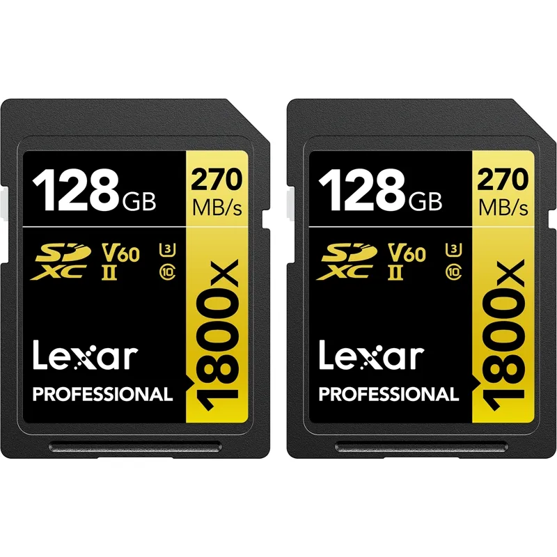 Lexar 128 GB Professional 1800x UHS-II SDXC atmiņas kartei (GOLD sērija, 2 gab.) ir 128 GB atmiņas ietilpība katrā kartē, un tā izmanto UHS-II kopni, lai atbalstītu tādas uzlabotas DSLR funkcijas kā nepārtraukta aizvara sērijas un ātra uzņemšana, kā arī raw un JPEG attēlu uzņemšana. Šī karte ir labi piemērota arī video uzņemšanai, tostarp 4K, 3D un Full HD video, un var sasniegt maksimālo nolasīšanas ātrumu līdz 270 MB/s un maksimālo rakstīšanas ātrumu līdz 180 MB/s. Pateicoties V60 ātruma klases novērtējumam, ir garantēts, ka minimālais rakstīšanas ātrums nesamazināsies zem 60 MB/s.