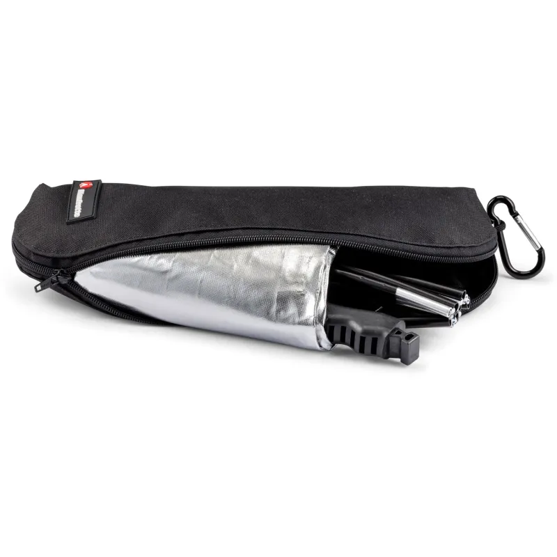 The rigid frame of the HaloCompact Plus is constructed using Manfrotto’s RapidExoframe™ technology. The collapsible lightweight aluminium frame quickly slots together and the reflector or diffuser fabric cover simply clips onto the frame using a newly designed ergonomic clip, offering more flex during assembly to make set up even easier. The cleverly designed RapidExoFrame™ construction allows the frame to breakdown into small multiple sections and along with the folded cover, packs into a carry case measuring only 29.5cm x 10.5cm x 6cm (11.6” x 4.1” x 2.3”) weighing only 450g (15.8oz).