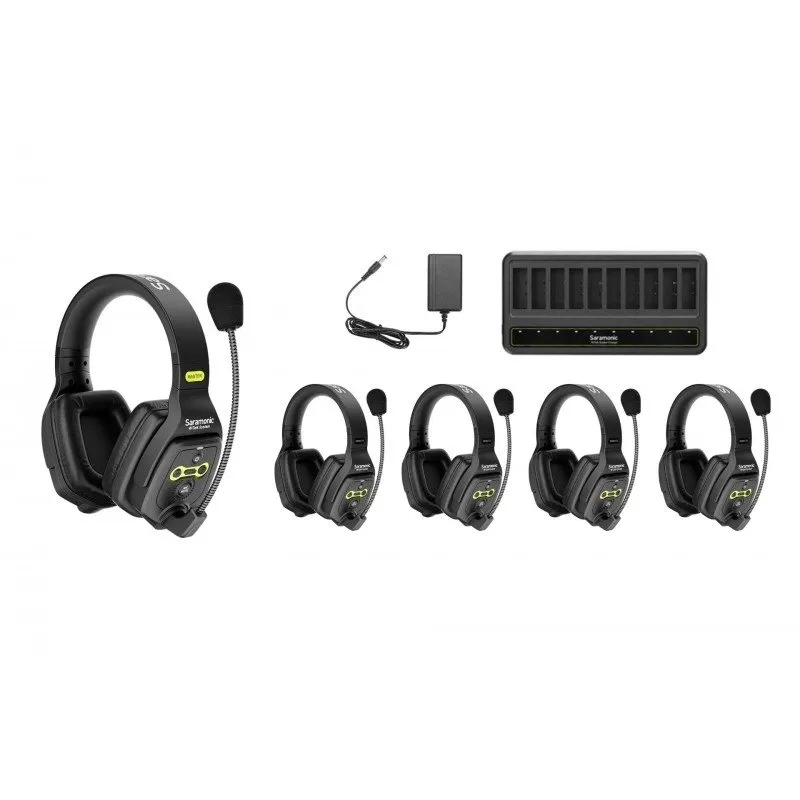 Saramonic WiTalk WT5D is a full-duplex wireless headset system, which with its functionality significantly surpasses popular walkie-talkies and half-duplex solutions. The kit includes 5 intercoms, a Peli carrying case and additional accessories. The hands-free use of the headsets will significantly increase work efficiency. With two-way communication offering an impressive range of 400 metres, all members of your team will hear each other loud and clear. Each headset features a replaceable 1200 mAh battery. The included charging station will charge up to 10 cells simultaneously. The intercoms also feature USB-C sockets for power bank top-ups. Main product features intercom system for wireless communication with full-duplex (full-duplex) an excellent alternative to the obsolete half-duplex system offered by popular walkie-talkies (among others) wireless intercoms offering 2-way real-time communication (you talk as if you were on the phone) hands-free intercom use increases team efficiency a great choice for those working on film sets includes up to 5 headsets (1 x Master and 4 x Remote) the microphone automatically mutes when you're not talking, reducing background noise from other callers frequencies 1787 - 1928 MHz provide up to 400 metres range between master and slave sets the ability to adjust the audio volume on each headset the role of the base station known from similar systems is performed by the master headset no separate base station saves space and gets the system ready quicker automatic intercom pairing at the touch of a button each headset is equipped with a replaceable 1200 mAh battery up to 10 hours of uninterrupted operation for the Master headset and up to 18 hours for the Remote headset included charging station that holds up to 10 batteries each intercom is equipped with a USB-C port for charging, including with a power bank each headset equipped with a microphone mute button soft sponge pads for hours of wearing comfort each headset has a built-in, adjustable microphone adjustable headset spacing to suit head size acoustic signals to indicate connection or disconnection of each intercom includes armoured Peli case two-way communication The Saramonic WiTalk WT5D wireless headset system is the ideal alternative to walkie-talkies, which offer half-duplex communication where individual callers have to take turns speaking. Here, communication takes place in real time, just like on the telephone. An additional advantage is that the microphones are deactivated when no one is speaking. This solution reduces the amount of noise and background noise heard in the headphones. With Saramonic WiTalk WT5D you will finally forget about interference, unintelligible words and broken sentences! Average range Working with wireless intercoms often involves communicating over large spaces. Unlike many competing products, the Saramonic WiTalk WT5D system supports a unique frequency range - 1787 - 1928 MHz. As a result, the distance between the Master and Remote headsets can be up to 400 metres! Multiple power ways Each headset included in the Saramonic WiTalk WT5D system features a removable rechargeable battery. This arrangement offers a huge advantage over devices that need to be plugged into a charger in their entirety. If spare batteries happen to be in use, no problem. You can connect any intercom to the powerbank via a USB-C port. The icing on the cake is the included charging station. With its help, you can charge up to 10 batteries simultaneously! Impressive runtime The 1,200 mAh interchangeable batteries that power each headset will provide impressive runtime with the Saramonic WiTalk WT5D system. Using two devices, you can expect 10 hours of uninterrupted communication. Working with all headsets will provide 5 hours of operation on a single charge. Intuitive operation The intercom marked Master acts as a base station, so you don't have to worry about having to set up additional devices. Simply launch the master headset and, with the push of a button, automatically pair additional devices to it. All headsets allow you to adjust the volume. Each also allows you to quickly mute the microphone with the Mute button. Ideal fit Thanks to the ergonomic design and the use of top-notch materials, you will not once forget that you have headphones on your head. The soft sponges surround your ears pleasantly and provide the highest wearing comfort. The adjustable headband allows you to adjust the headset to the shape of your head. If necessary, you can also change the position of the microphone at any time. Its maximum tilt automatically deactivates it, just like the Mute button. Safe transport Included with the Saramonic WiTalk WT5D wireless headphone system you will find a special Peli case equipped with robust latching mechanisms and a comfortable handle. It has been completely filled with flexible plastic to provide the highest level of protection for your equipment. Profiled compartments ensure that every item in the system is adequately protected during transport. Specification model: Saramonic WiTalk WT5D Dual-Ear Master Headset transmission mode: FDX (full duplex) modulation mode: GFSK supported frequencies: 1787 - 1928 MHz microphone type: capacitor type range: up to 400 m frequency response: 300 Hz - 5 KHz output power: power consumption: signal-to-noise ratio (SNR): > 65 dB crossing: power supply: built-in Li-ion battery (3.7 V, 1200 mAh) or USB-C DC (5V) operating time per charge: 10 hours (working with 2 remote headsets) / 5 hours (working with 4 remote headsets) imensions: 175.1 x 203.1 x 85.8 mm weight: 360 g Remote headset (Dual-Ear Remote Headset) transmission mode: FDX (full duplex) modulation mode: GFSK supported frequencies: 1787 - 1928 MHz microphone type: capacitor type range: up to 400 m frequency response: 300 Hz - 5 KHz output power: power consumption: signal-to-noise ratio (SNR): > 65 dB crossing: power supply: built-in Li-ion battery (3.7 V, 1200 mAh) or USB-C DC (5V