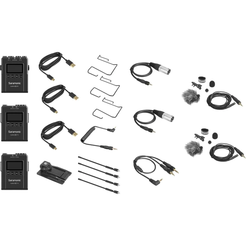 2x UwMic9S transmitter; 1x UwMic9S receiver; 2x DK3A tie-pin microphone with cable; 1x 3.5 mm TRS cable; 2x XLR male cable; 1x 3.5 mm splitter cable; 3x USB-A to USB-C charging cable; 1x Hotshoe adapter for receiver; 4x Plop cap; 4x Windshield; 2x Cable tie; 2x Tie pin (clamp); 3x Trouser clip for transmitter; 1x Case; 1x Manual; 1x Warranty certificate; 2x Saramonic sticker; 1x Packaging